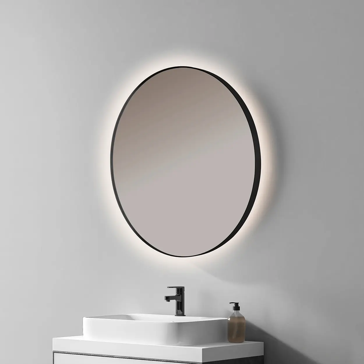 – Espejo liso de forma redonda con marco metálico negro.