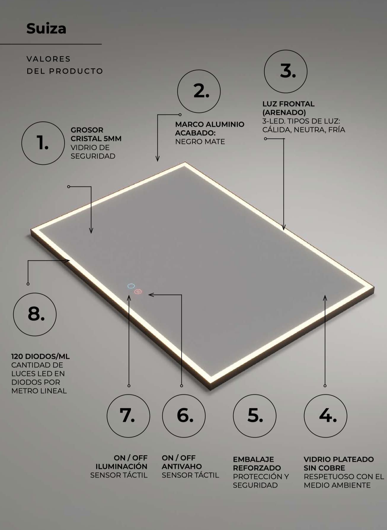 Te presentamos las principales características del espejo negro baño modelo SUIZA de LEDImex: