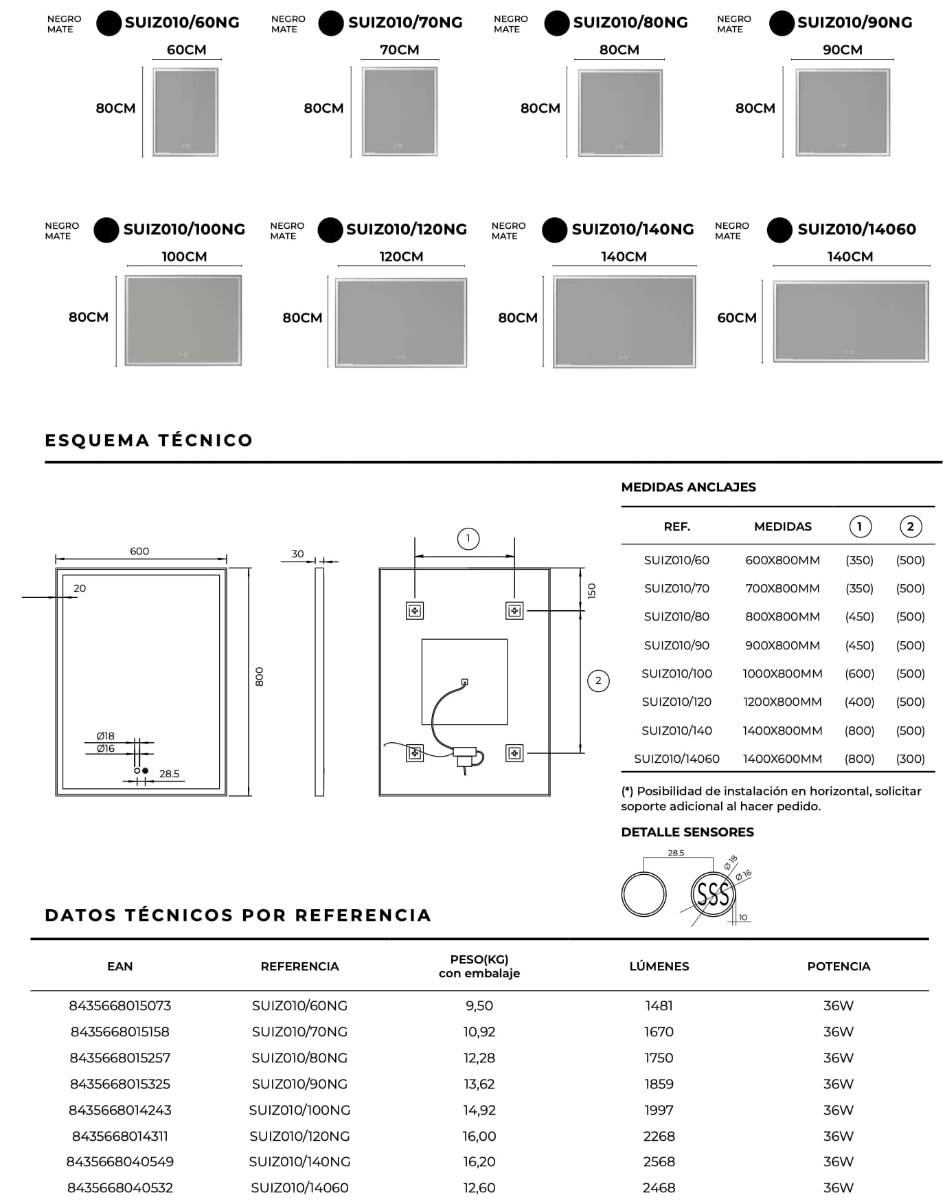| Ancho del espejo | 60 cm ,70 cm ,80 cm ,90 cm ,100 cm ,120 cm ,140 cm |
