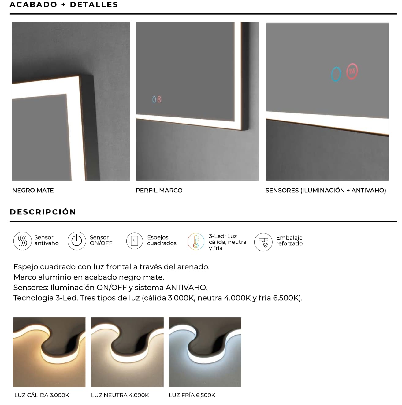 - Espejo CUADRADO LED con marco negro.