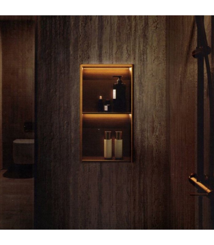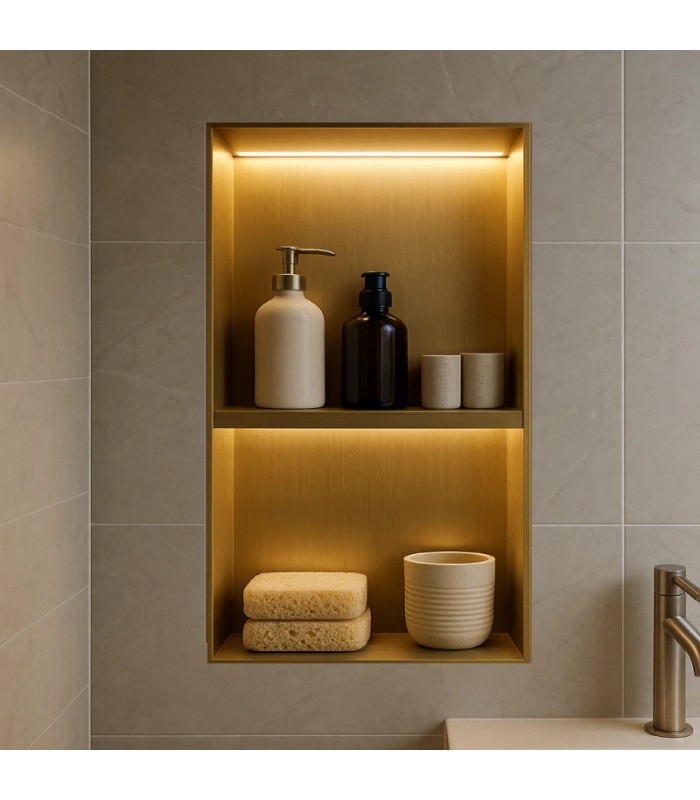 Hornacina para baño vertical con dos estantes oro cepillado con luz led Marshall