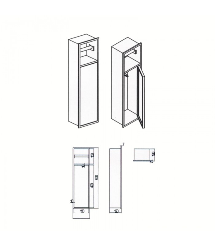 Diseño vertical con escrobillero empotrado y portarrollos.