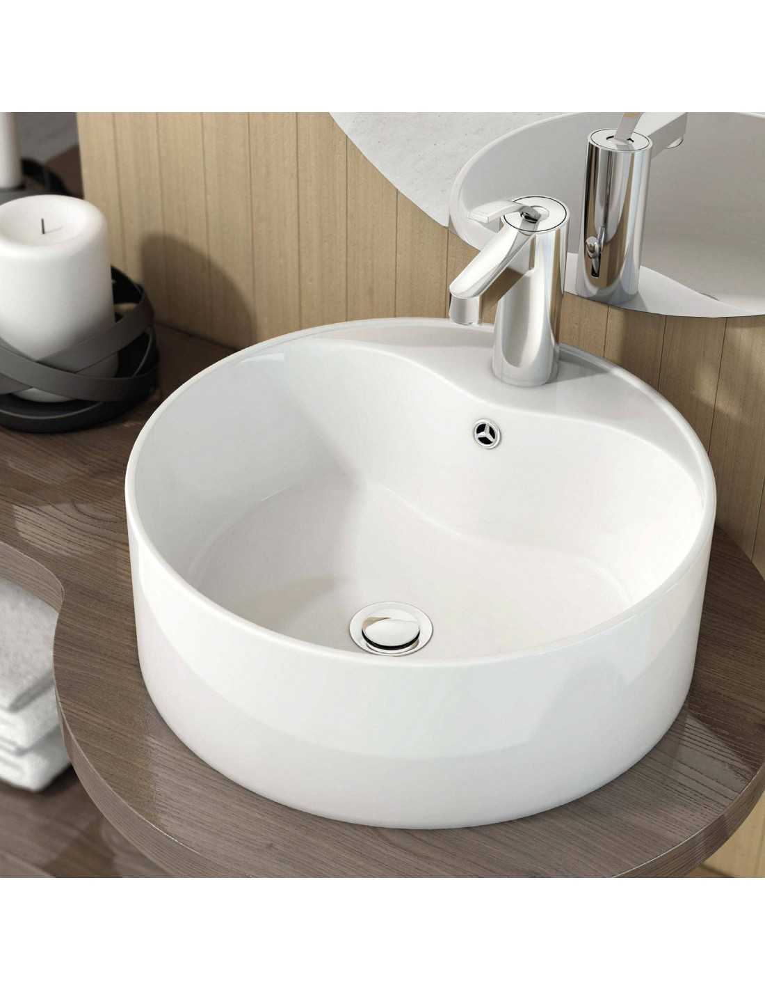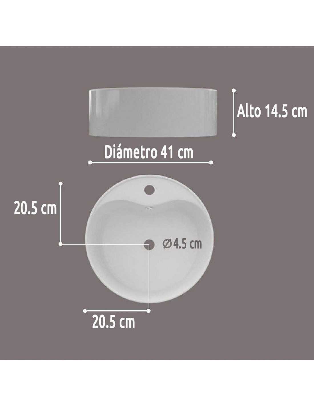 Lavabo sobre encimera un seno con rebosadero, fabricado en cerámica color blanco, sus medidas de 41cm Diámetro x 14.5cm Alto.