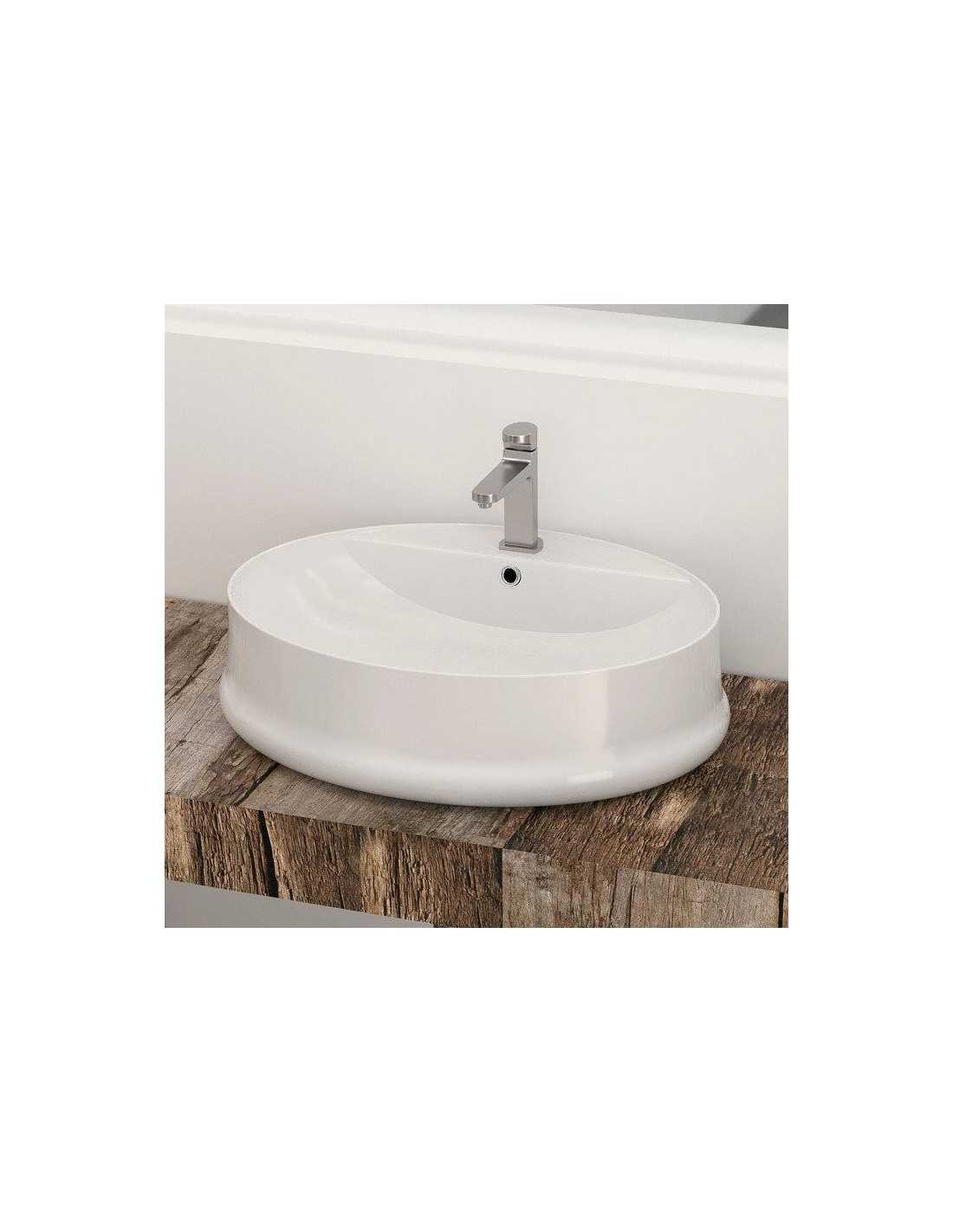 Lavabo sobre encimera un seno con rebosadero, fabricado en cerámica color blanco, sus medidas de 56cm Ancho x 44cm Fondo x 17cm Alto.