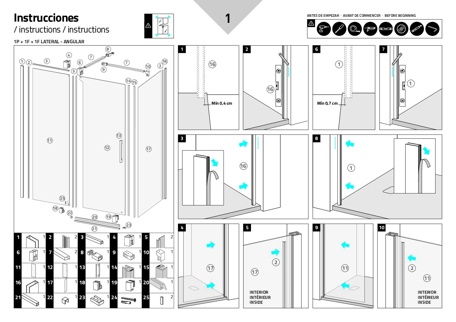| Tipo de mampara | Frontal 1 fijo + 1 corredera + 1 fijo |