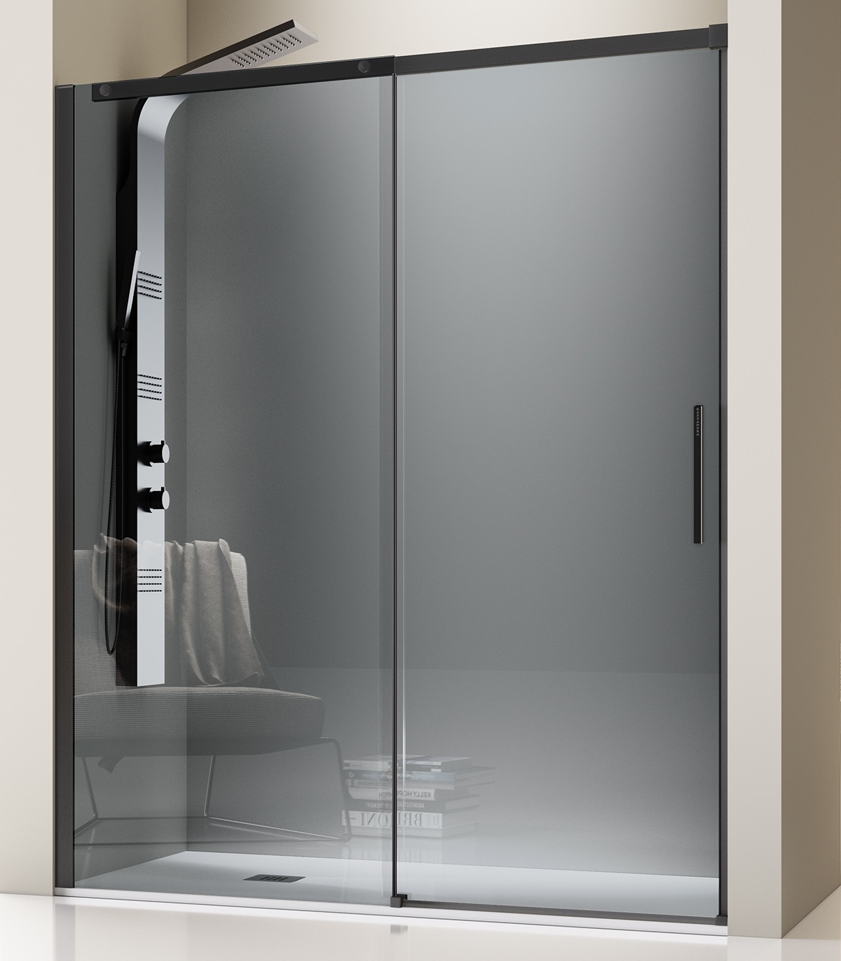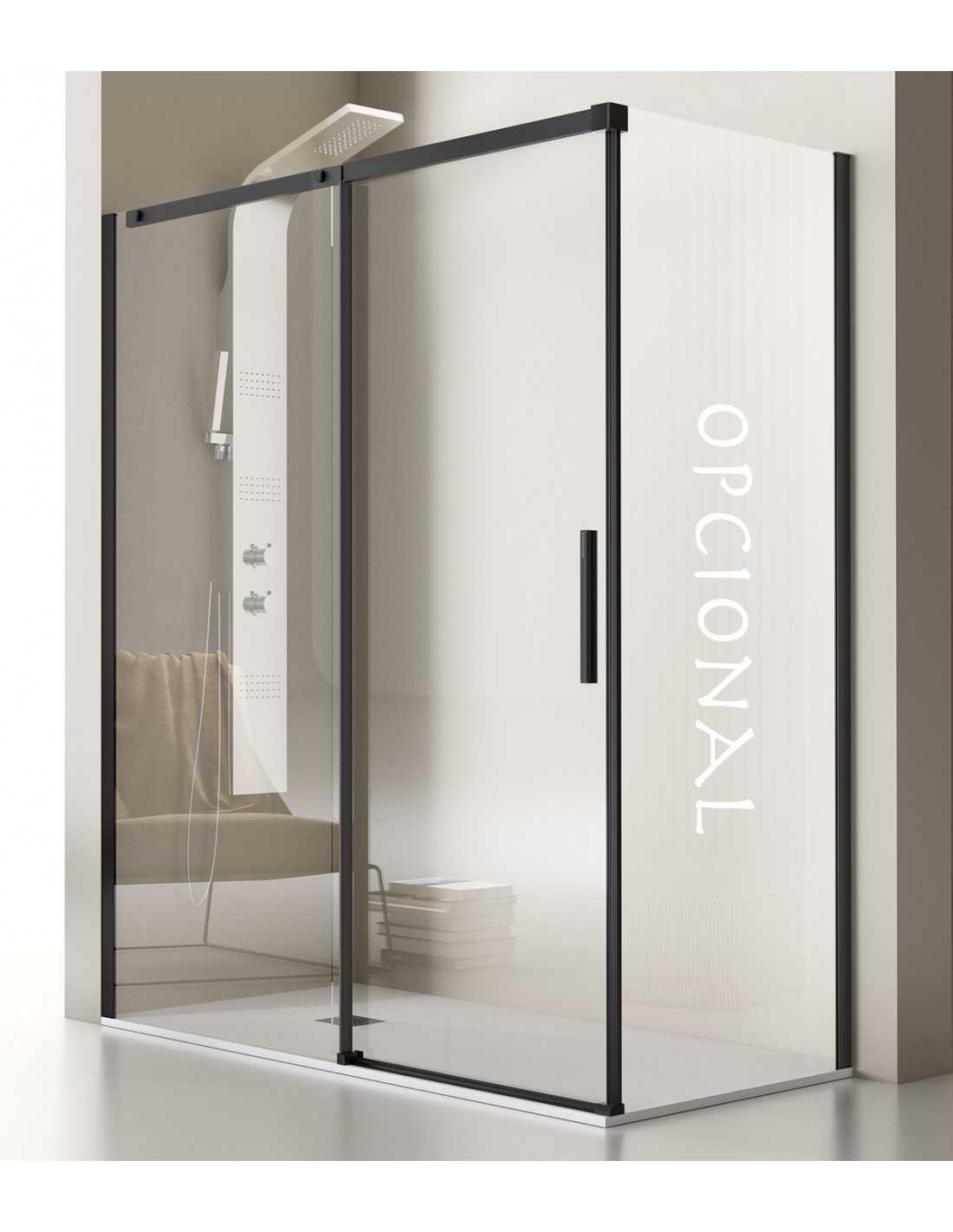 Mampara frontal fijo con puerta corredera LUNA de Kassandra Negra (lateral opcional)