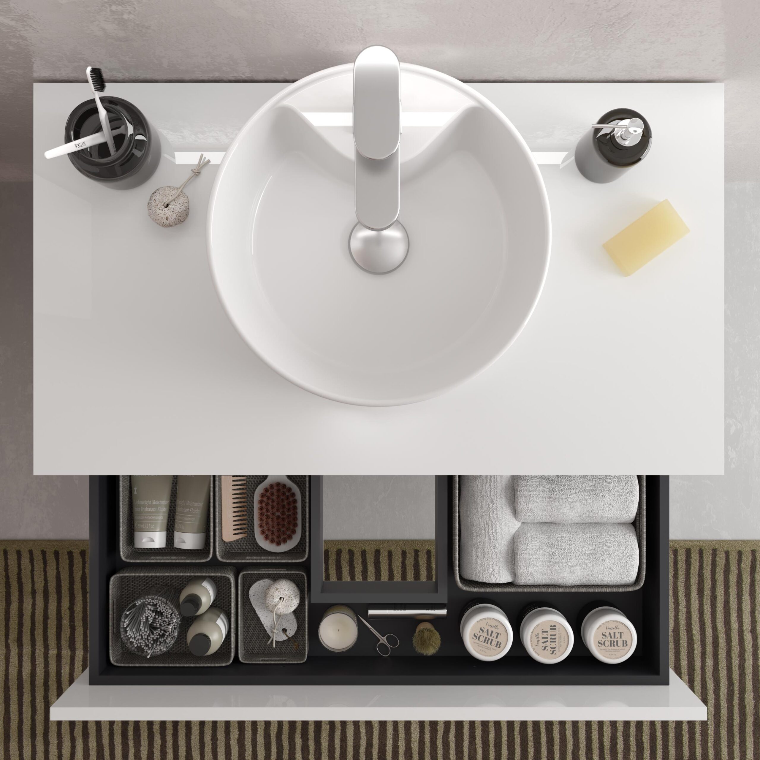 Gracias a su estructura modular, variedad de medidas y posibilidad de combinar con lavabos de encastre o de apoyo, Bequia proporciona una versatilidad excepcional.