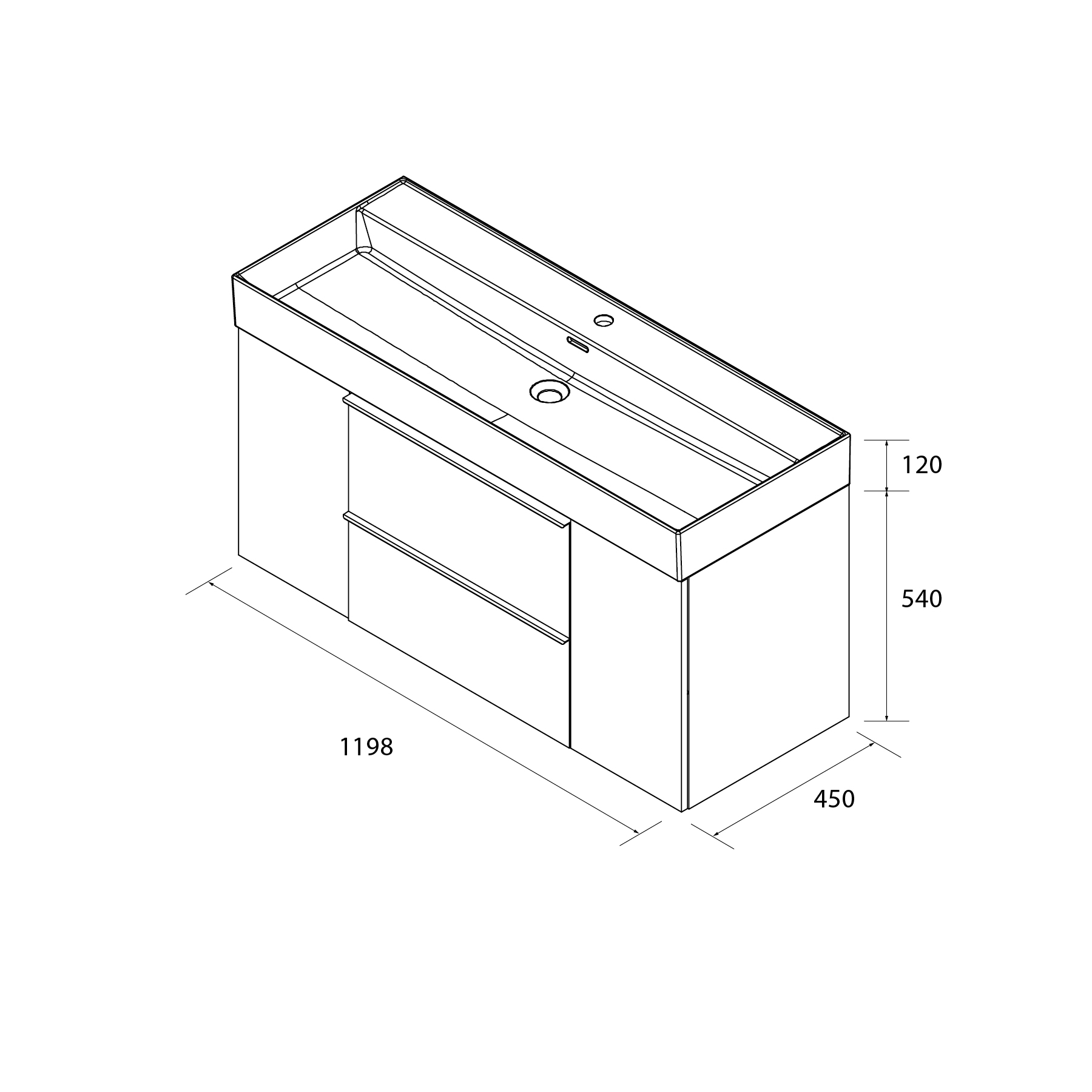 Mueble: 1200 mm (ancho) × 450 mm (fondo) × 540 mm (alto)