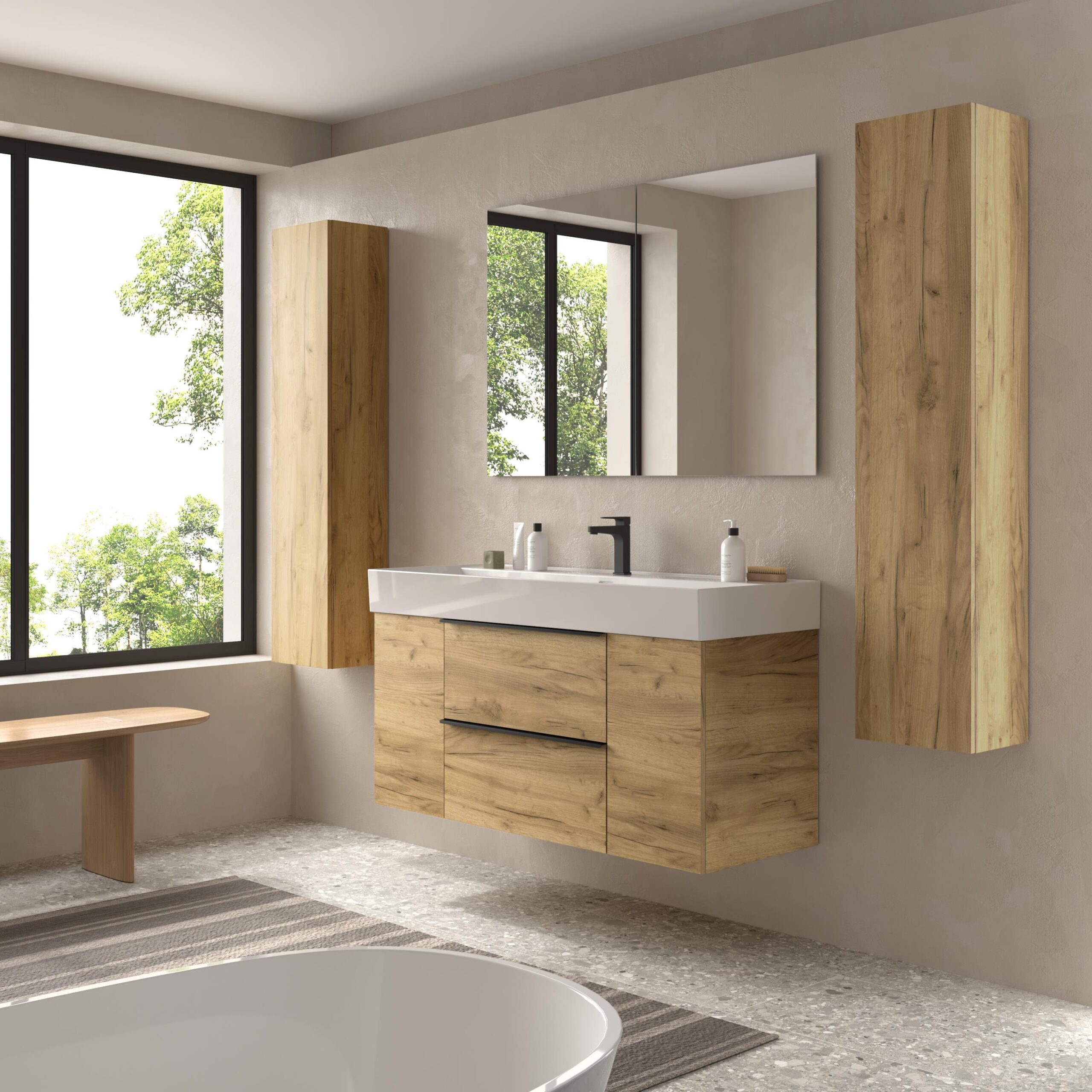 La serie de muebles de baño Nabua en su versión de 120 cm con 2 cajones y 2 puertas lleva el diseño a su máxima expresión de sencillez. Sin tiradores ni adornos superfluos, su estética limpia y atemporal encaja en cualquier estilo de baño.