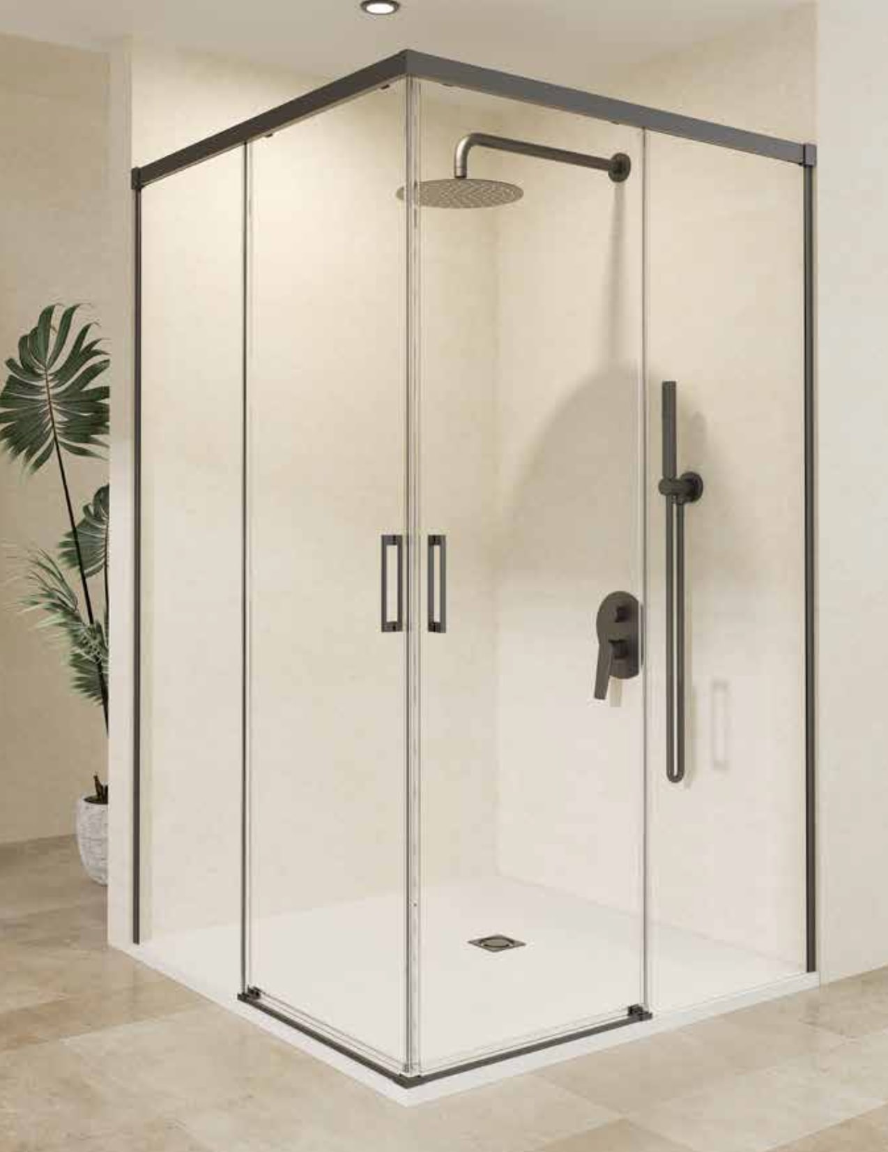 Mampara de ducha angular 2 fijos y dos correderas con apertura al vértice Perfil Black gun metal.
