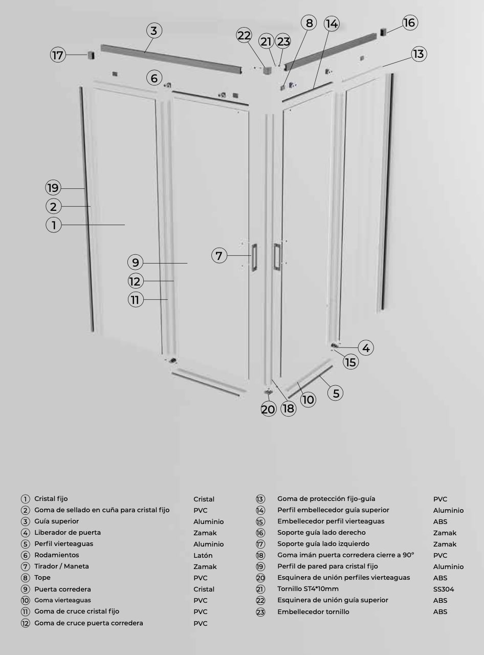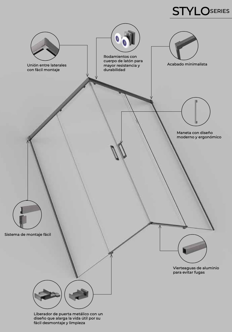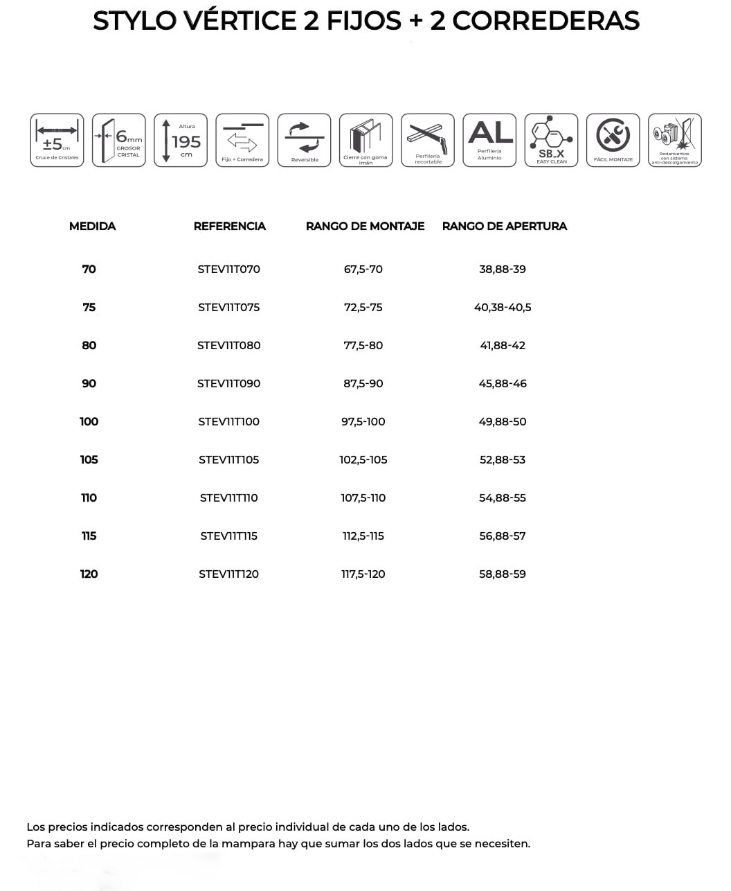 | Tipo de mampara | Angular 2 fijos + 2 correderas |