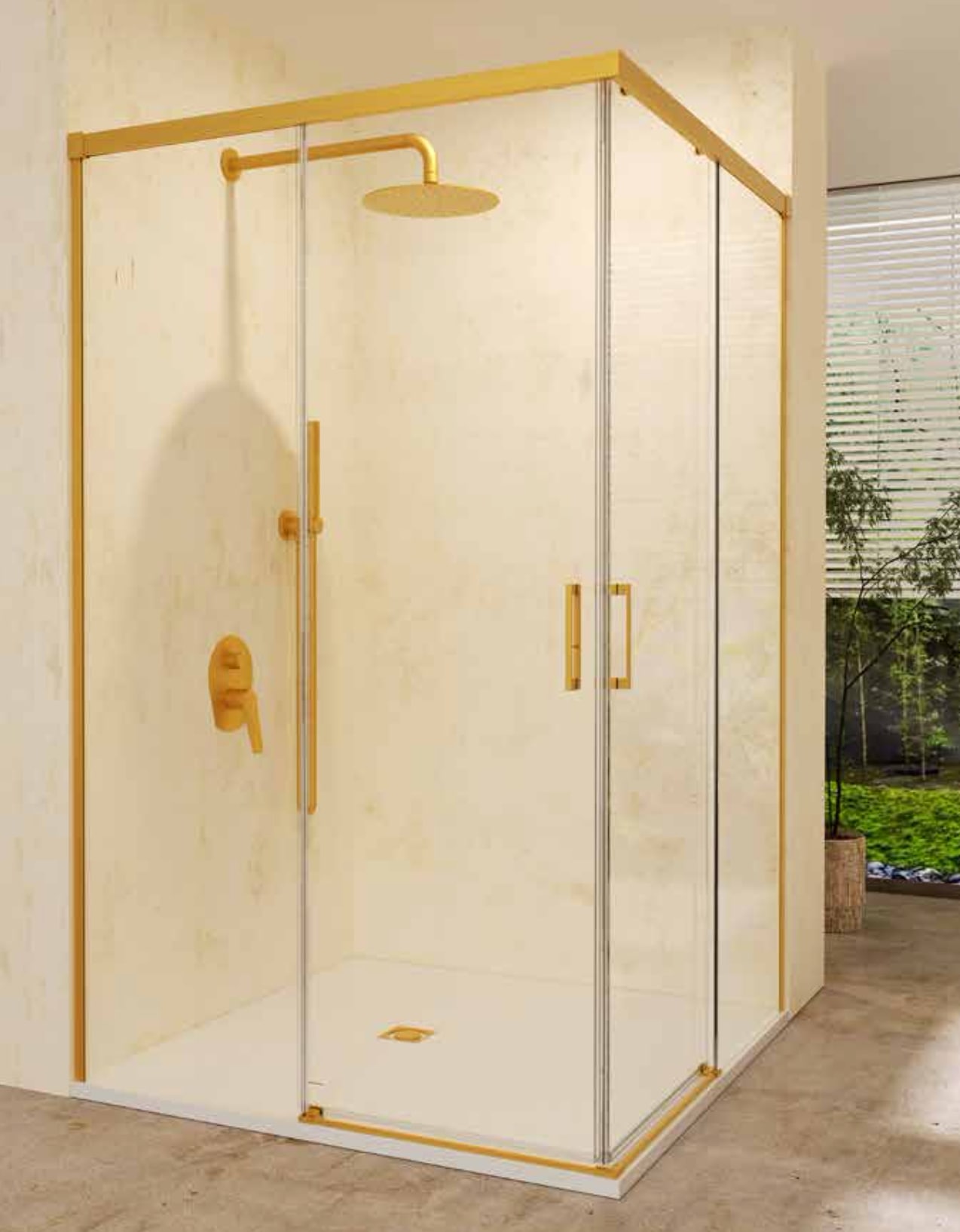 Mampara de ducha angular corredera Stylo SBX 2F+2C apertura al vértice Oro cepillado.