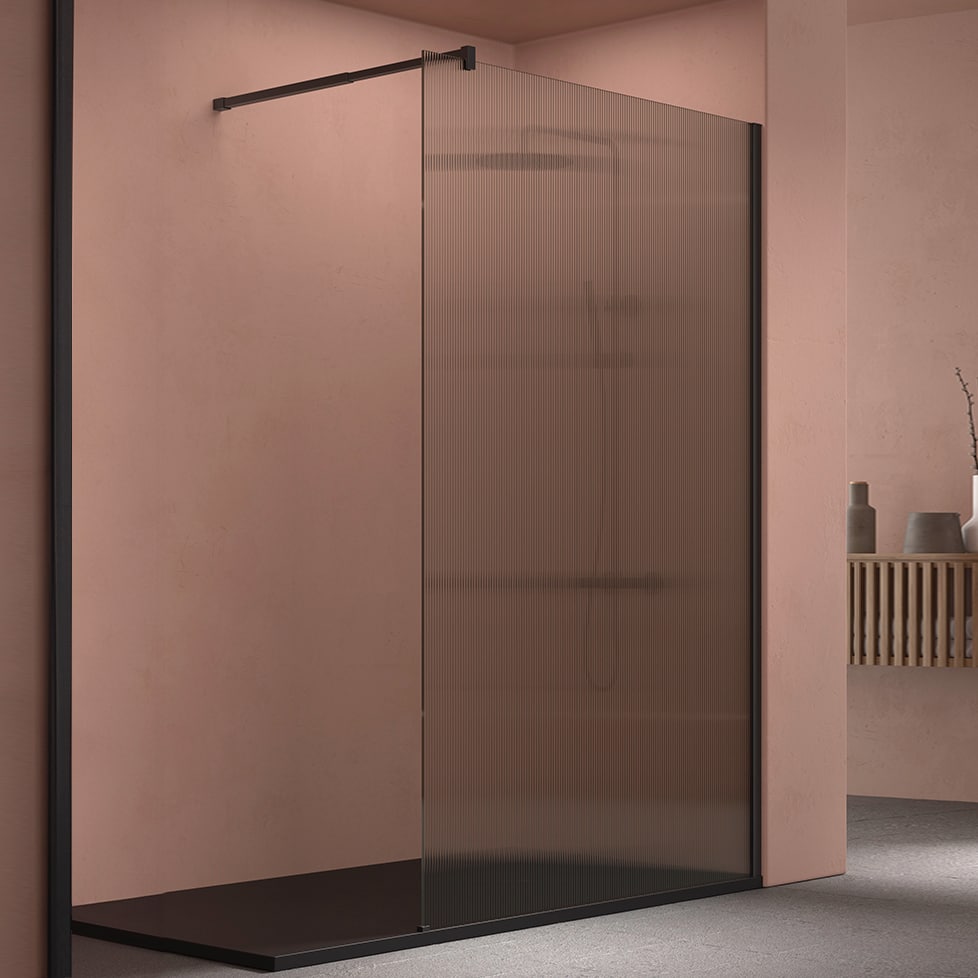 Mampara de ducha fijo SBX de Imex perfil negro con cristal acanalado.