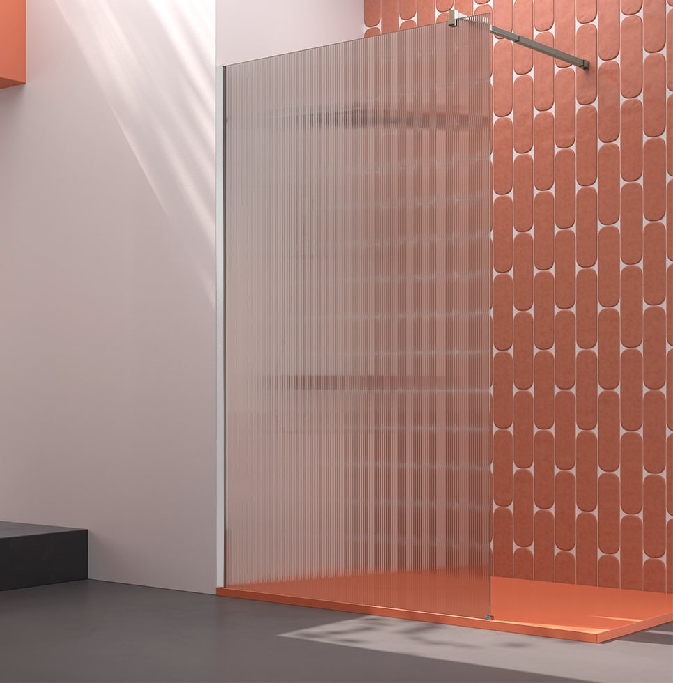 Mampara de ducha fijo SBX de Imex perfil Niquel cepillado con cristal acanalado.